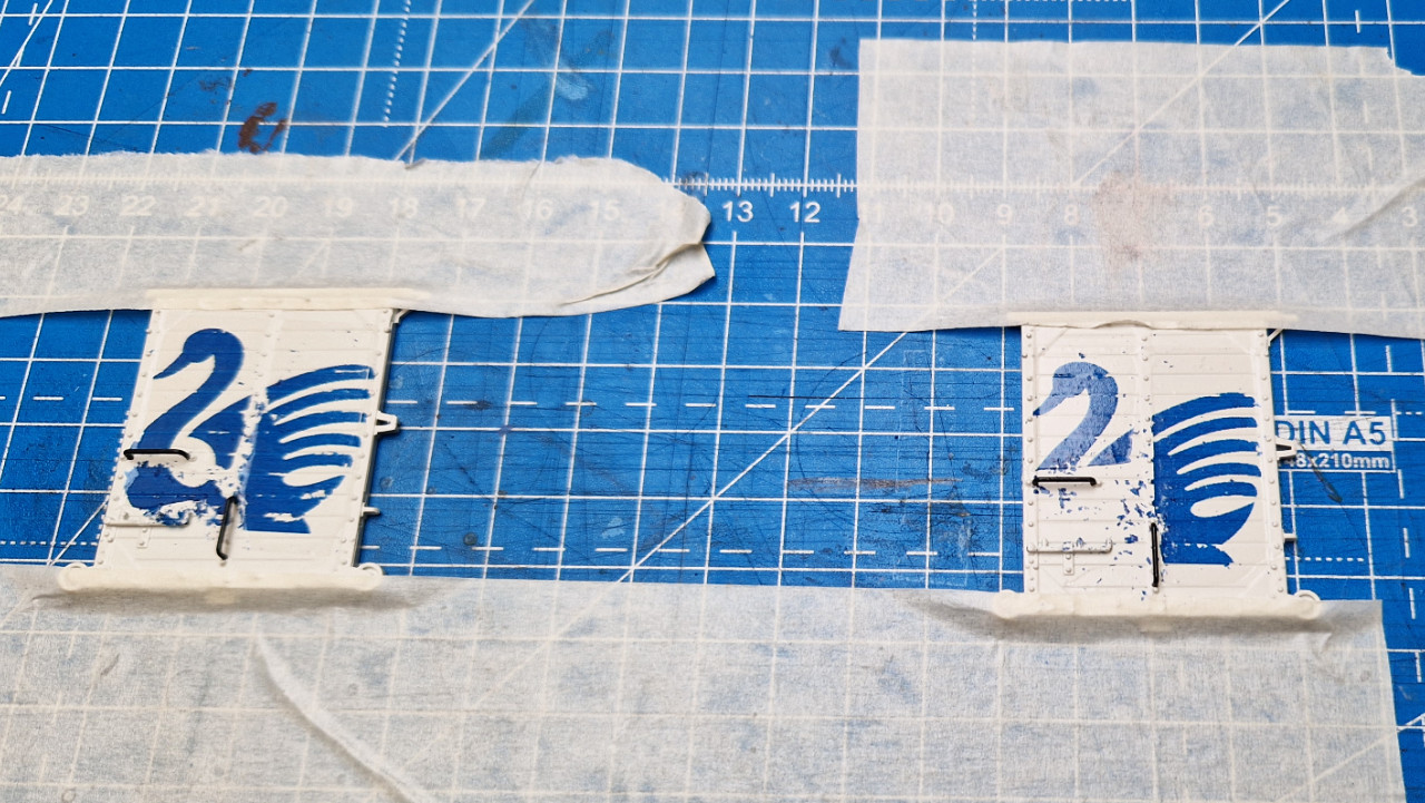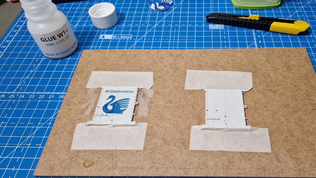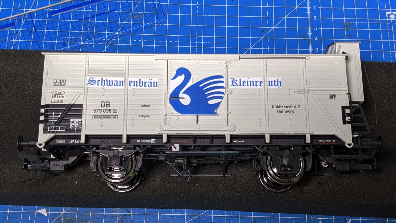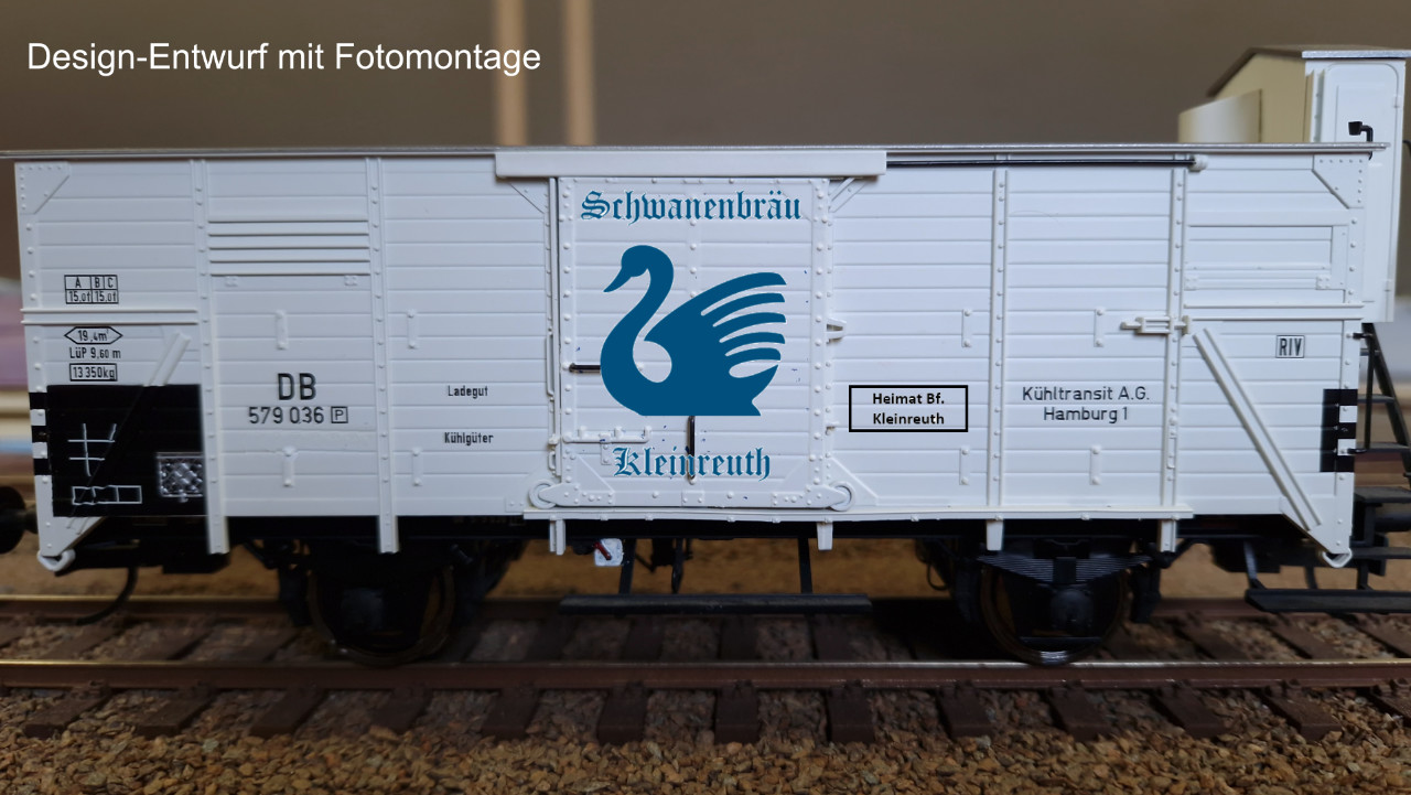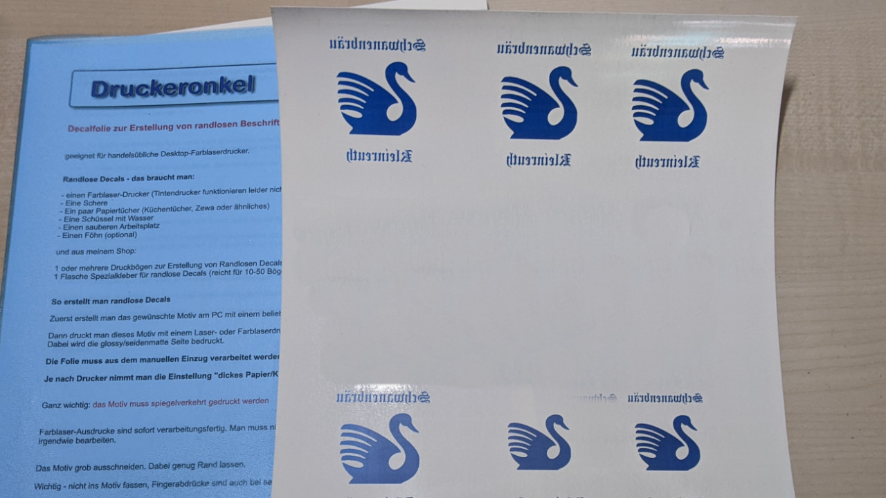 Mein Lenz G10 WĂ€rmeschutzwagen (KĂŒhlwagen) soll mit Logo und Text „SchwanenbrĂ€u Kleinreuth“ aufgewertet werden. Bekannte Methoden, wie Nass-Schiebebilder oder Aufreibe-Bilder, kamen nicht zum Einsatz. Ich wollte möglichst alles im DIY herstellen. Dazu hatte ich Verwendung von Decalfolie trĂ€gerlos geplant. Schrift und Logo werden mit dem Laserdrucker gedruckt. Die Methode ist Ă€hnlich dem Fototransfer-Potch, nur dass bei „trĂ€gerloser Decalfolie“ die Beschriftung mittels TrĂ€gerfolie aufgebracht wird. Nach dem Trockenvorgang bleibt der Toner auf dem Zielobjekt, die TrĂ€gerfolie wird aber abgezogen.