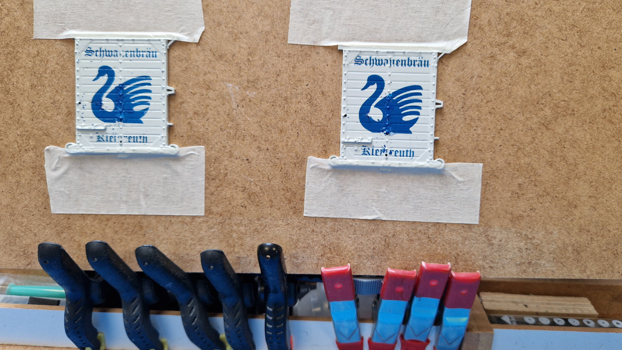Die Arbeitsschritte, wie oben beschrieben, haben sich fast nicht geĂ€ndert. Lediglich in drei Schritten wurde das Logo aufgebracht: Schwan – Schrift SchwanenbrĂ€u – Schrift Kleinreuth. Den Rat eines guten Freundes, die (beim Transfer störenden) TĂŒrgriffe zu entfernen habe ich befolgt.
