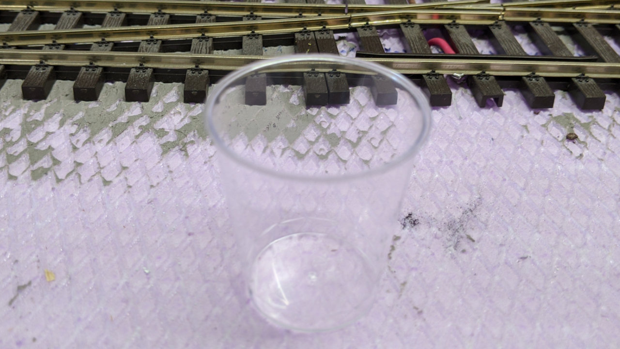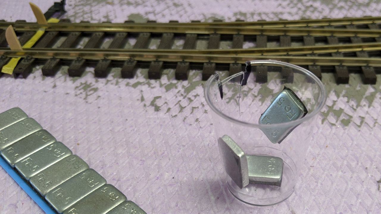 Die Stellschwelle habe ich mit Tamiya Maskierband abgeklebt, anschließend die Stellschwelle durch zwei Hölzchen (Mundspatel) mittig fixiert. Ziel war einen möglichst gleichmäßigen Farbauftrag zu erreichen, ohne zusätzlichen Farbpinseleinsatz. Für den Schutz des Stellbockes etc. nahm ich Mischbecher (Mixing Cups). Damit der Becher nicht „wegsegelt“ habe ich ihn mit selbstklebenden Auswuchtgewichten beschwert. Passt.