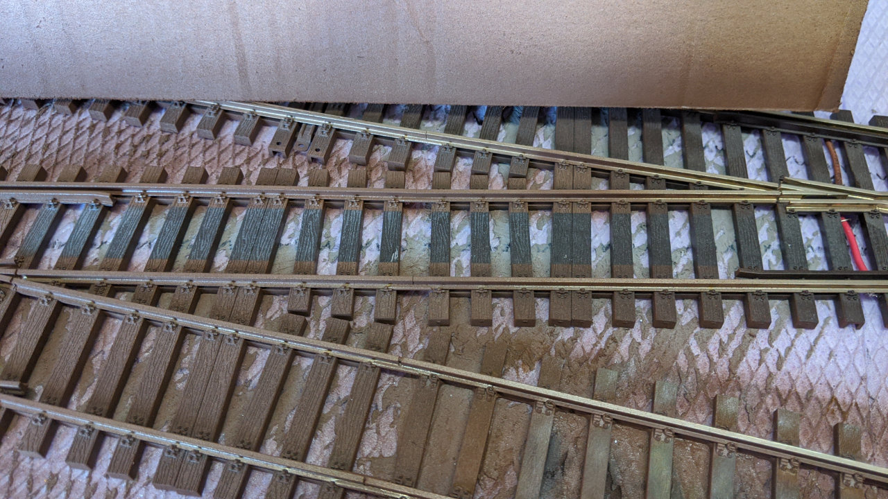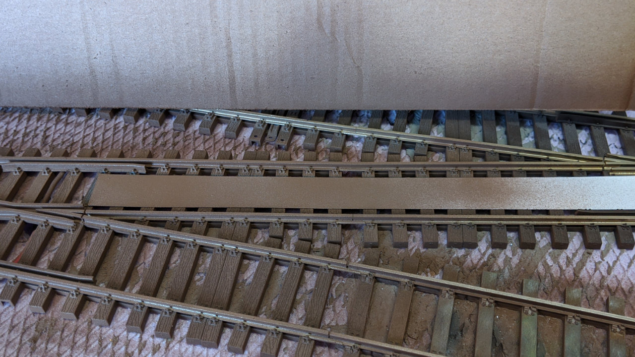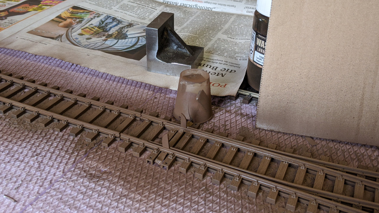 Auf einem kleinen Stück testete ich, die Schwellen mittig von der Schienenfarbe freizuhalten. Kann man machen. Die leider scharfen Farbtrennkanten gefallen mir nicht so sehr. Ich werde also im weiteren Verlauf wie bei meinem ersten Abstellgleis Schienen und Schwellen einheitlich färben und danach die Schwellen weiter farblich behandeln, wie schon von an anderer Stelle beschrieben.