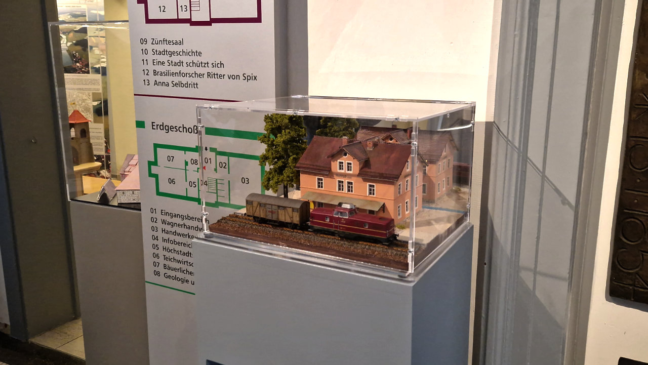 Mein Modell des Stationsgebäudes habe ich heute dem Heimatmuseum Höchstadt/Aisch geschenkt. Es hat dort einen würdigen Platz gefunden und wird vielleicht später einmal dem an der Stadtgeschichte interessierten Besucher zeigen, wie einst das Bahnhofsgebäude aussah.