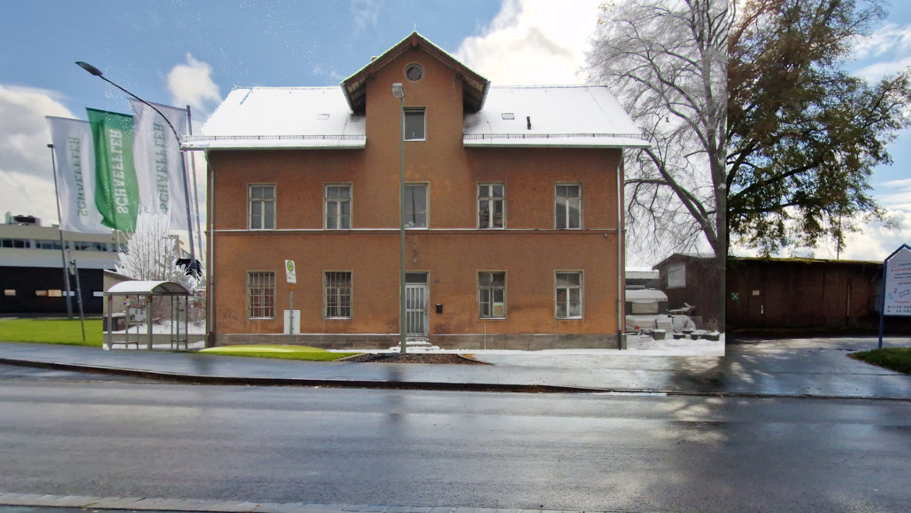 Hier ein aktuelles Bild (2024-09) des ehemaligen Bahnhofsgeländes; der Güterschuppen (in Privatbesitz) steht noch. Daneben das gleiche Bild mit einmontiertem Bahnhofsfoto von Februar 2011.