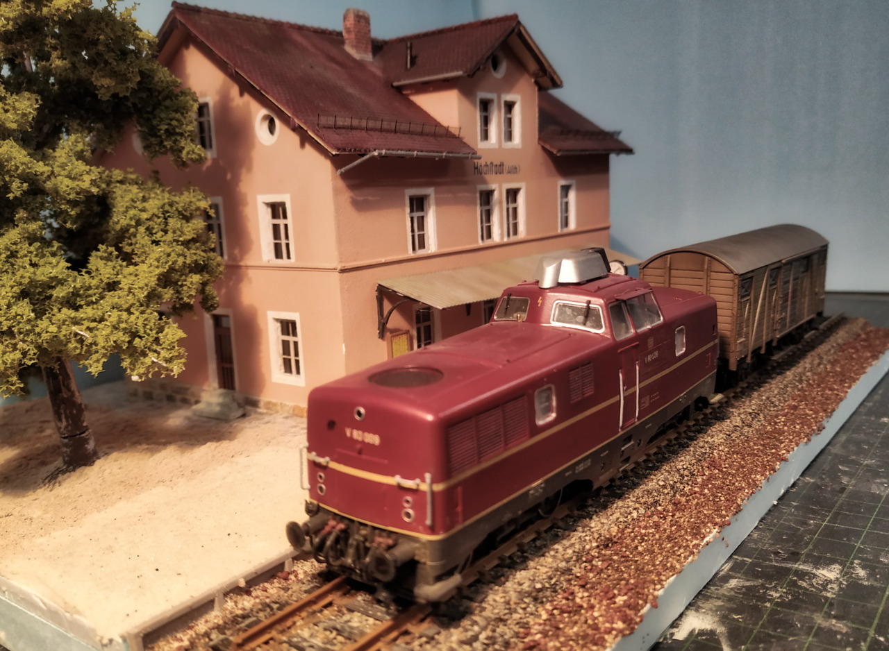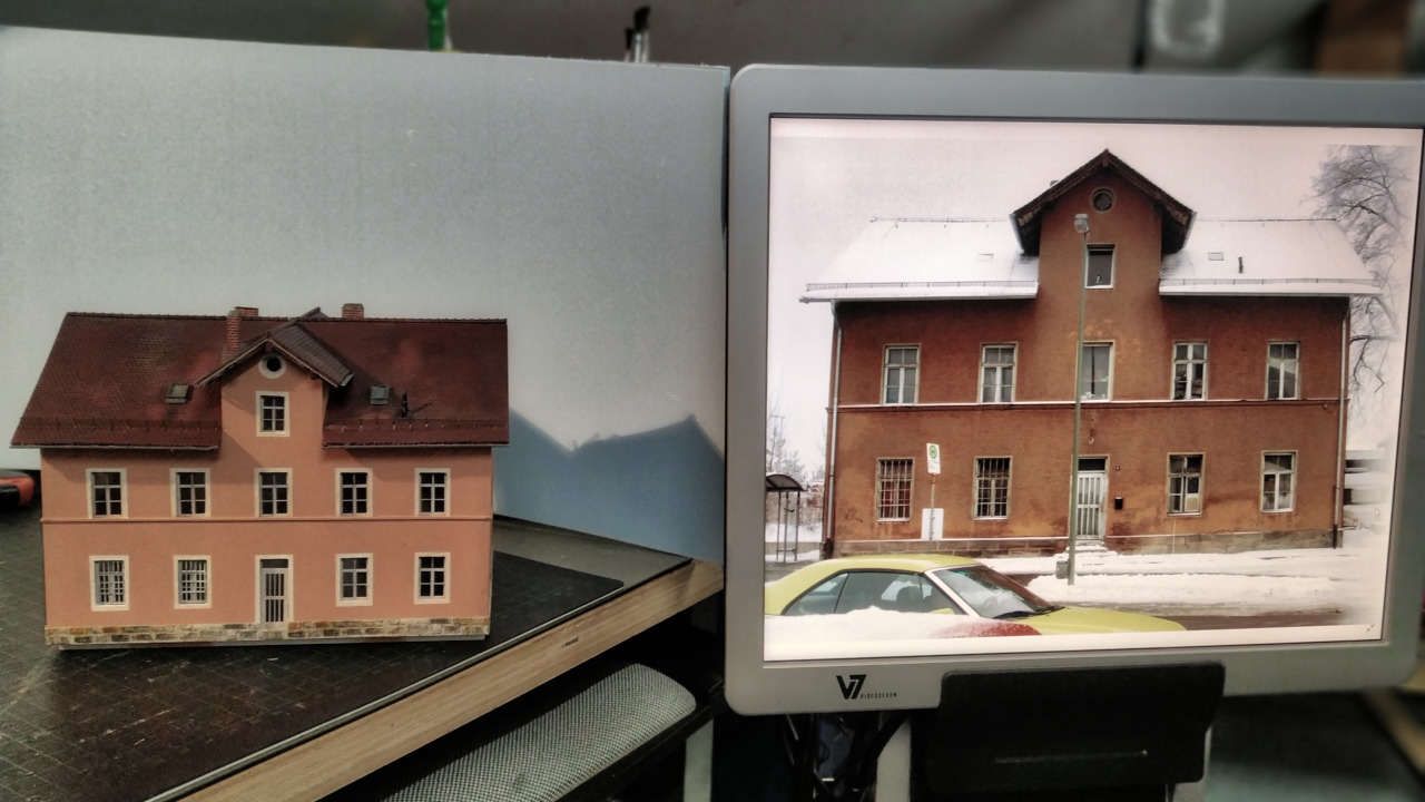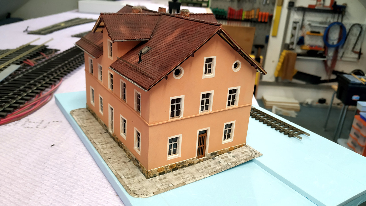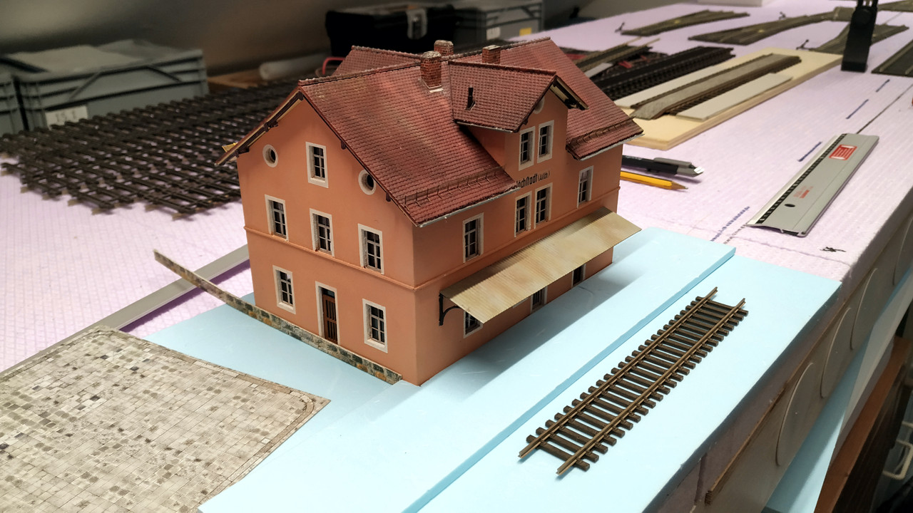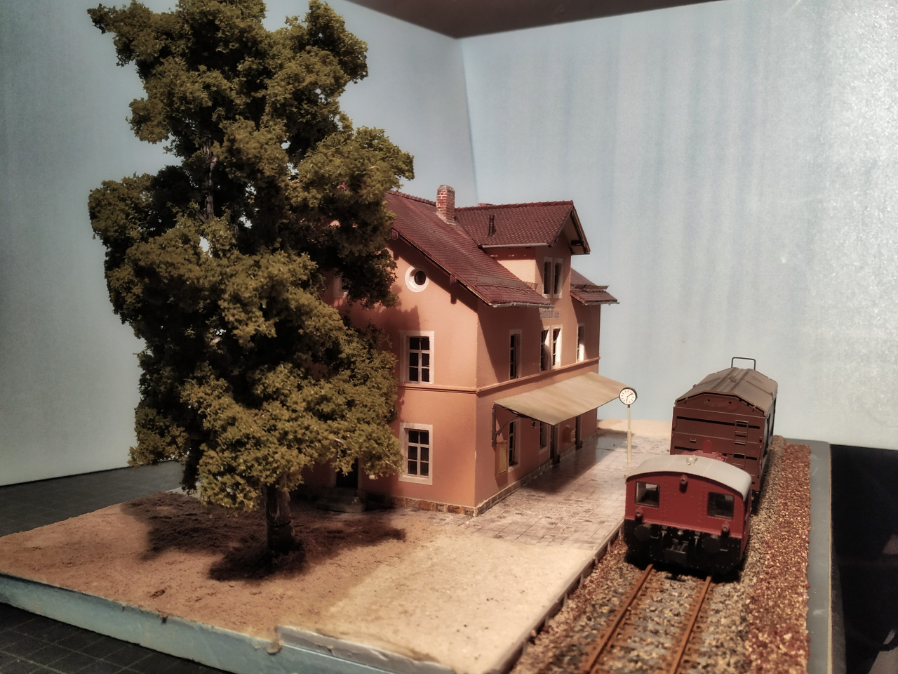 So beschloss ich, das Stationsgebäude Höchstadt/Aisch zusammen mit etwas Ausstattungsmaterial als „Diorama unter Acrylhaube“ fertigzustellen.