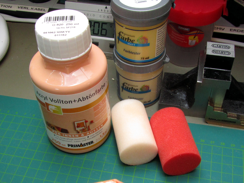 Da kam ich auf die Idee, die WĂ€nde mit Dispersionsfarbe zu streichen. Versuche fĂŒhrte ich auf einem ProbematerialstĂŒck durch. Die Farbe trocknete schön matt auf. Allerdings waren die Pinselstriche gut zu sehen. Ich nahm dann eine kleine Schaumstoffwalze um die mit dem Pinsel aufgetragene Farbe zu „verteilen“. Das gab eine brauchbare OberflĂ€che.