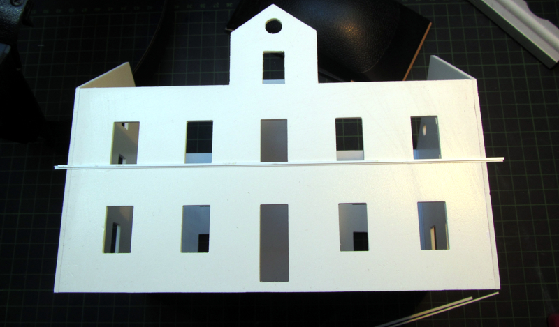 Baustatus ist im Augenblick: Die Fenstergesimse werden angebracht (Evergreen 0,25*1,5mm mit aufgesetztem Streifen 0,5*1,0 mm):