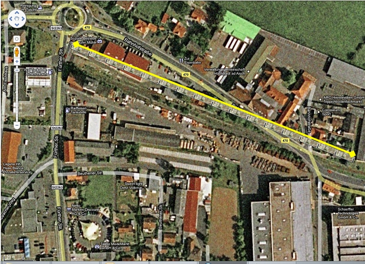 - Über Google Earth holte ich mir einen Lageplan des Bahnhofes Höchstadt um die Längenausdehnung festzustellen: