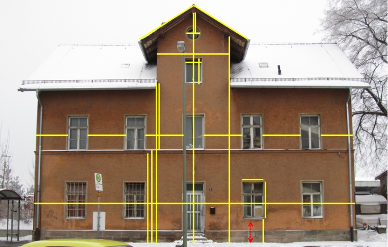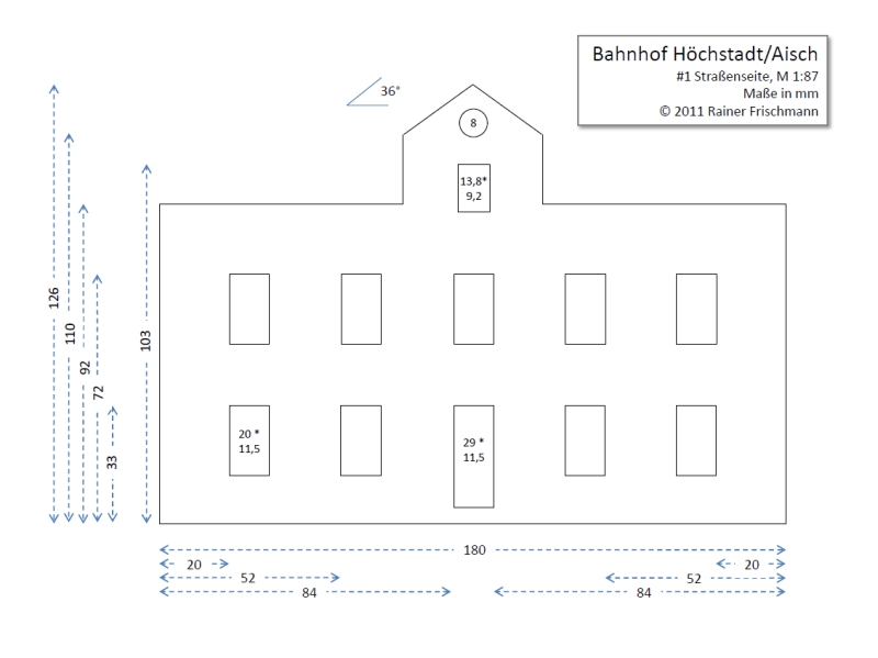Merke: 1 Meter real ist ein Zentimeter auf der Zeichnung. Mit mehreren „Meßlinien“ habe ich so alle notwendigen Maße aus der Fotografie ermittelt. Anhand dieser Maße erstellte ich dann auf einem weiteren Blatt aus den Formen (Elemente in Powerpoint) die Strassenansicht des Bahnhofes. Die Fenster werde ich wohl bei Willi Winsen beziehen, da diese in der benötigten Größe gelasert werden. In der Zeichnung habe ich dies bereits so vorgesehen.