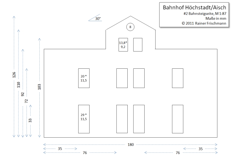 Hier das Bahnhofsgebäude von der Gleisseite. Grundlage für die Zeichnung war die Zeichnung der Straßenseite, es sind aber doch einige größere „Abweichungen der Gebäude-Symmetrie“ von Rück- zu Vorderseite (Dachneigung, Anzahl und Positionierung von Fenstern und Türen).