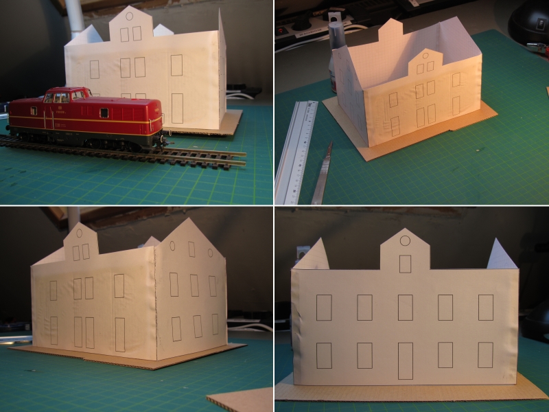 Testaufbau mit Bastelbogen. Alle 4 Außenwände des Bahnhofes Höchstadt/Aisch sind fertig gezeichnet. Da wollte ich schon mal wissen, wie denn das Gebäude in 1:87 ungefähr wirken könnte.