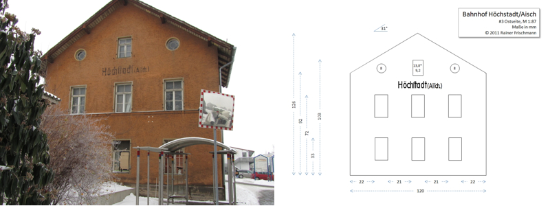 Stichwort Gravur: Nachdem der Bahnhofsname Höchstadt weder auf einem Schild noch erhaben auf dem Mauerwerk angebracht ist sondern „aufgemalt“, beabsichtige ich diesen Schriftzug gleich in die Dateien einzufügen und gravieren zu lassen. Siehe Bildbeispiel: