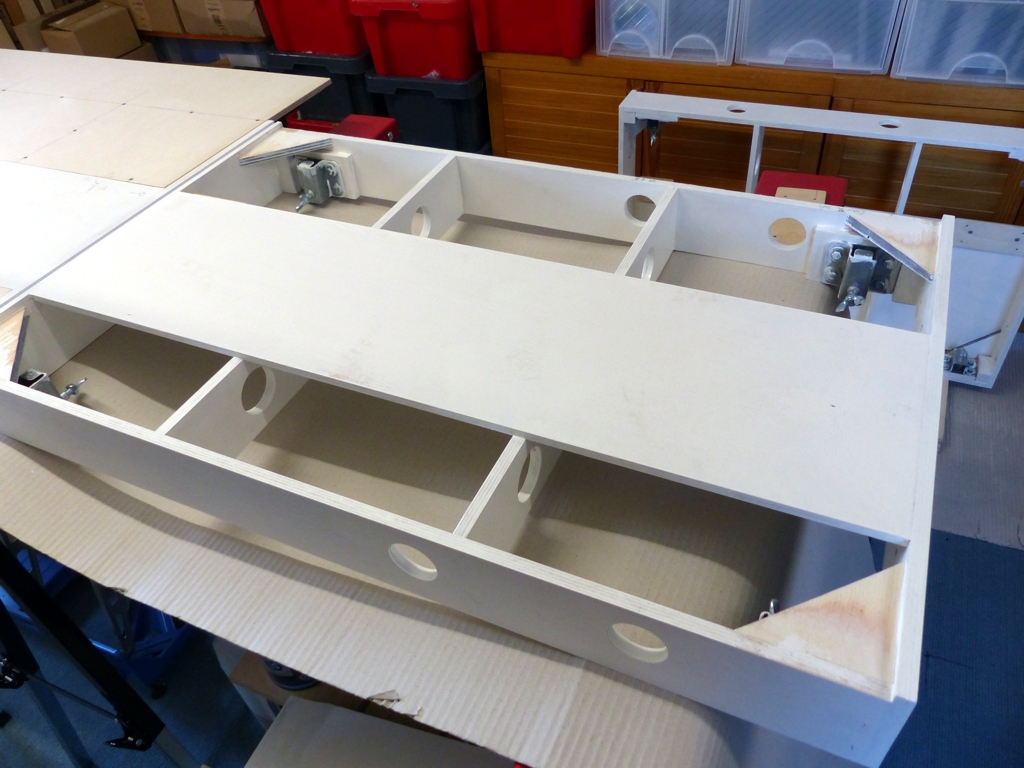 Im April begann ich mit dem Bau der 4 Segmentkästen für mein Projekt. Jedes Segment hat die Außenabmessung 95 x 60 cm bei 10 cm Höhe. Die Kopfplatten der Segmente sind ähnlich FREMO F96, ohne Damm und Graben, auf 60cm Breite angepasst.