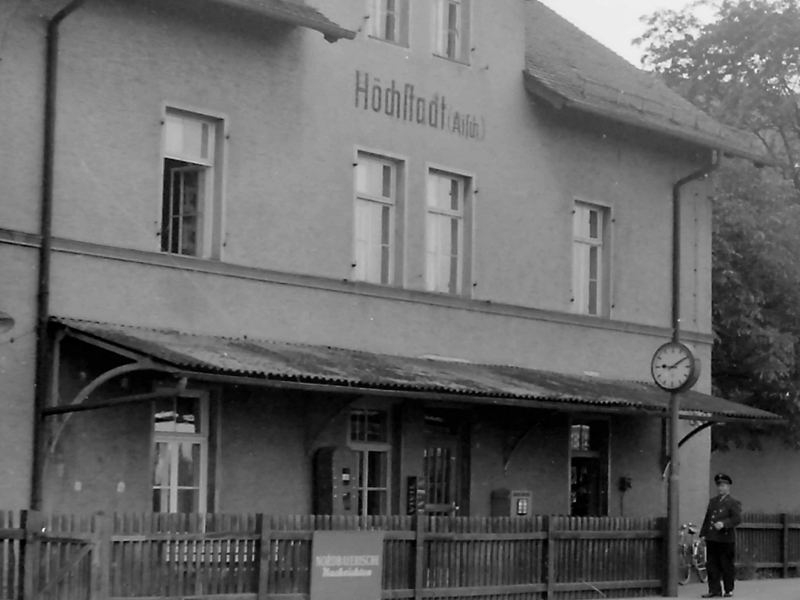 Durch einen über YouTube geknüpften Kontakt erhielt ich ein weiteres Bild des Stationsgebäudes Höchstadt/Aisch von der Bahnsteigseite. Aus dieser Aufnahme geht eindeutig hervor, dass meine Annahme von ursprünglich vier Türen nicht haltbar ist. Vielmehr hatte das Stationsgebäude mittig nur rechts eine Türe, links davon