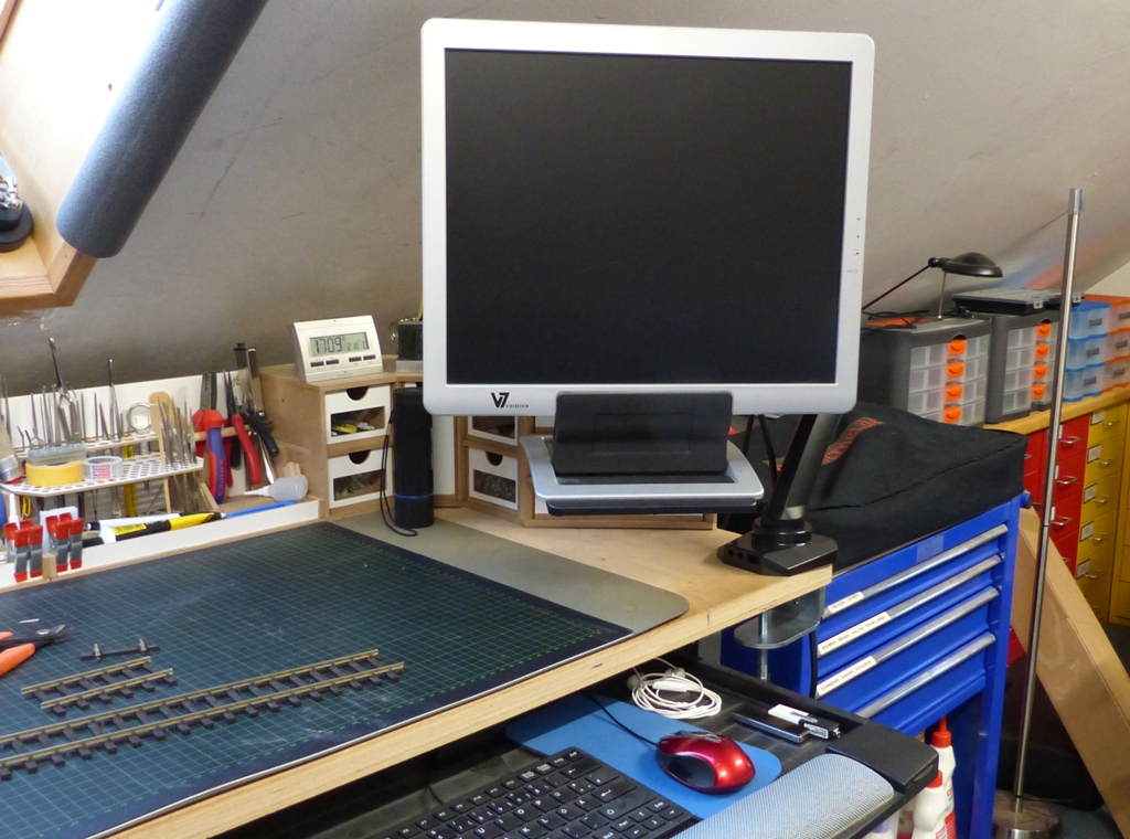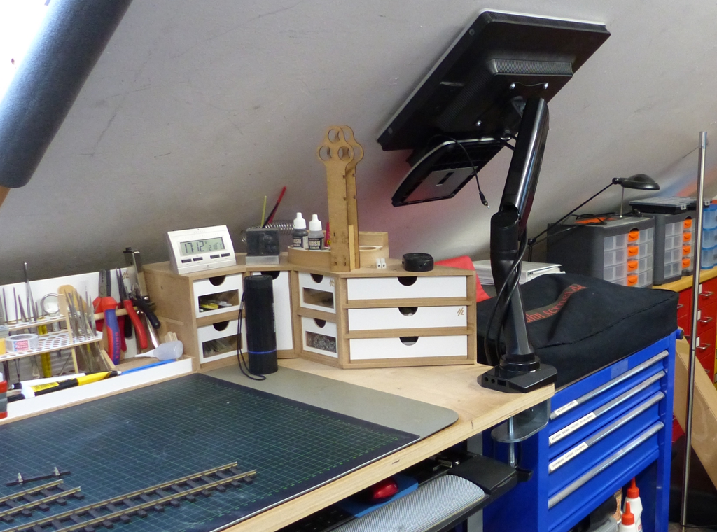 Jetzt kann ich entspannt an meiner Werkbank arbeiten, mit und ohne PC-Monitor, denn der ist nicht mehr im Weg sondern bei Bedarf weg.